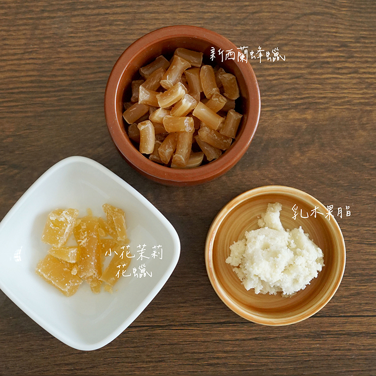 有機蜂蠟、乳木果脂、茉莉花蠟、維他命E