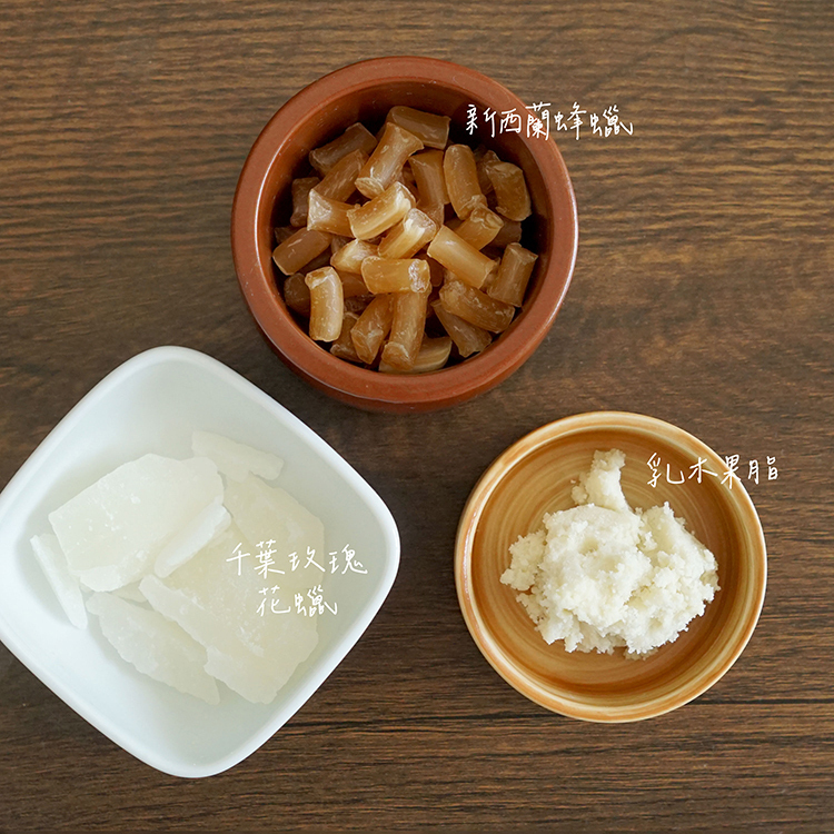 有機蜂蠟、乳木果脂、攻瑰花蠟、維他命E